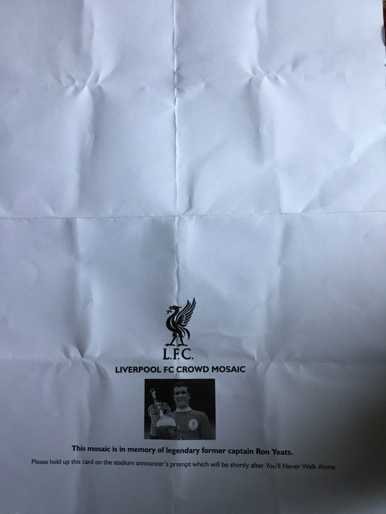 In the ground as kick off approaches those of us on the Kop all have pieces of card under our seats to make a giant mosaic in tribute to Ron. These are held up in unison at the end of the traditional singing of ‘You’ll Never Walk Alone’ while the rest of the ground joins in a minutes applause for him. Of course the vast majority of the ground will never have seen him play but we owe him a huge debt. Even in retirement, he returned to the club in a scouting capacity and sourced both John Aldridge and Sami Hyypia. RIP Rowdy.