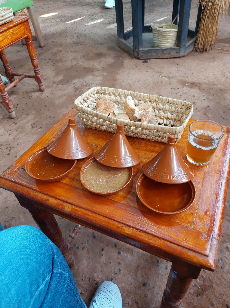Having been so impressed with the views of the mountains it seemed only right to go and see them close up and that’s what we did on our final day. On the way up we passed through a Berber village and then stopped at a spice shop. The middle of the tajin pots below containing a delicious peanut based concoction.