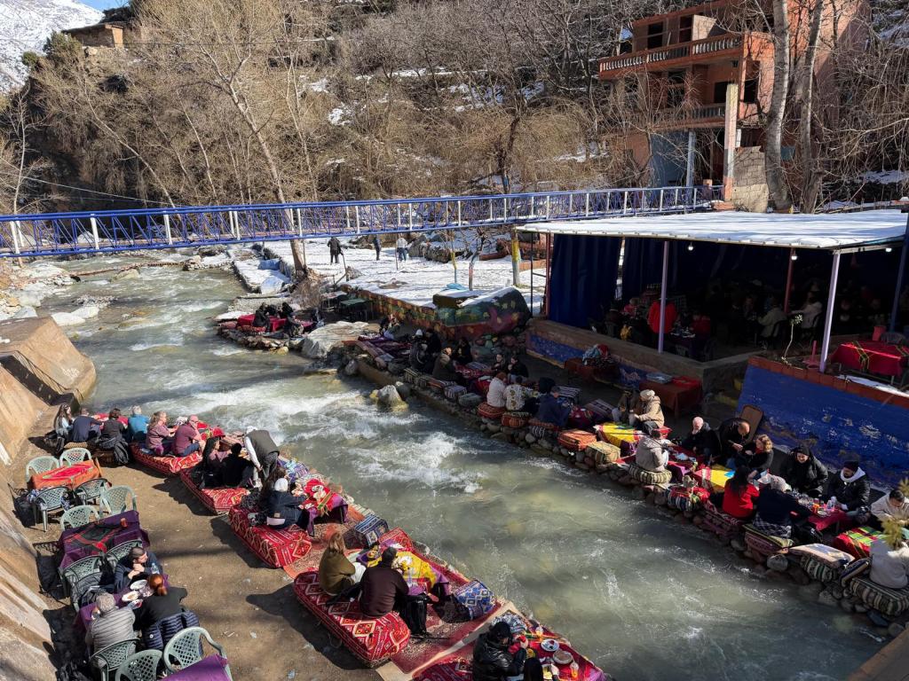 The climb both up and down the mountains was quite tricky being both slippery from snow and ice while packed with other tourists. It was well worth it at the top if only for the waterfall. Well deserved tea and cakes were taken in the picturesque setting by the river at the bottom. Another Moroccan place where the cats were well fed and plentiful.